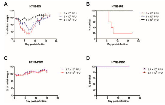 Virulence comparison in mice infected with reverse genetics generated influenza A/Anhui/1/2013 (H7N9-RG) virus or a version containing a polybasic cleavage site in HA (H7N9-PBC). Groups of mice (n = 5) were infected intranasally with 10-fold serial dilutions of H7N9-RG virus, starting at a dose of 5 × 104 PFU. Weight loss (A) and survival (B) of H7N9-RG infected mice were measured for 17 days post-infection. For H7N9-PBC virus, groups of mice (n = 6) were infected intranasally with either 3.7 × 106 or 3.7 × 105 PFU of virus, and weight loss (C) and survival (D) of the mice are shown.