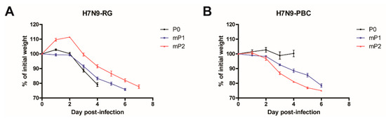 Pathogenesis of influenza A (H7N9) viruses containing a polybasic HA cleavage site upon serial passaging in mice. Mice (n = 3) were infected with 7 x 105 PFU of either (A) A/Anhui/1/2013 (H7N9-RG, P0) or (B) A/Anhui/1/2013 (H7N9) containing a polybasic HA cleavage site (H7N9-PBC, P0). Mice were sacrificed on day 4 post-infection and lung homogenates from each mouse was collected for passaging. For the first passage of H7N9-RG and H7N9-PBC viruses in mice (mP1), groups of mice (n = 6) were infected with 50 µL of lung homogenates collected from P0 infected mice, respectively. For the second passage (mP2), three mice from each mP1-infected group were sacrificed on day 6 post-infection, and lung homogenates were collected and used to infect mice (n = 3). Mean weight loss (%) ± standard error of mean of infected mice are shown.