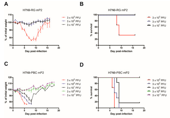 Determination of mouse median lethal dose (MLD50) for mouse-passaged H7N9 viruses. Groups of mice (n = 6) were infected intranasally with a dose range of 3 × 10−1 to 3 × 103 PFU of either H7N9-RG mP2 (A,B) or H7N9-PBC mP2 (C,D) viruses. Mean percent weight loss ± standard error of mean (A,C) and survival curves (B,D) for each virus are shown.