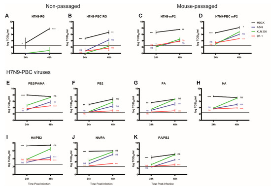 Growth of H7N9-PBC influenza viruses in mammalian cell lines. Viral replication was determined in Madin Darby Canine Kidney (MDCK), human lung (A549), mouse lung (KLN 205), and chicken fibroblast (DF-1) cell lines at 24 and 48 h post-infection with 0.5 µg/mL TPCK-trypsin supplemented into the culture medium. Viral titers were determined by TCID50 assay using MDCK cells with 1.0 µg/mL TPCK-trypsin in the medium. Non-passaged (A) H7N9-RG and (B) H7N9-PBC RG viruses were compared to their respective mouse-passaged (mP2) versions, (C) H7N9-mP2 and (D) H7N9-PBC mP2. Replication was also determined for the reverse genetics engineered H7N9-PBC mP2 virus (E, PB2/PA/HA), the recombinant H7N9-PBC viruses containing single mutations in (F) PB2, (G) PA, or (H) HA, or double mutations in (I) HA/PB2, (J) HA/PA, or (K) PA/PB2. Dotted line on each graph represents the limit of detection of the TCID50 assay. Mean viral titers and standard error of mean are shown, two-way ANOVA with Bonferroni post-tests was performed comparing all results to KLN 205 at each time point, ns = not significant, * or ** or *** denotes p-values of <0.05, or <0.01, <0.001, respectively.