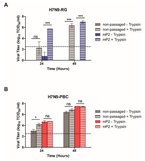 3.6. H7N9-PBC Viruses Replicate in a Trypsin-Independent Manner