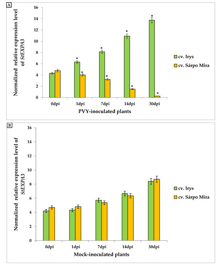 The normalized relative expression levels of StEXPA3 calculated based on the reference gene StEf1α in potato virus Y (PVY)-inoculated (A) and in mock-inoculated (B) cv. Irys and cv. Sárpo Mira leaves between 0 to 30 dpi in combination with ANOVA. Mean values of normalized expression levels were evaluated at the p < 0.05 level of significance using a post-hoc Tukey’s honest significant difference test (Tukey HSD test). Statistically significant values on different days after mock or viral inoculation for the cultivars are marked by asterisks (*) above the mean value of the normalized expression on each bar.