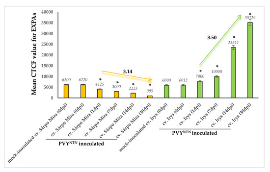 Quantitative fluorescence signals of StEXPAs using the corrected total cell fluorescence method (CTCF) in combination with ANOVA. The orange charts represent mock-inoculated and PVY-inoculated cv. Sárpo Mira (resistant) potato plants at 0, 1, 7, 14, and 30 dpi. The orange arrow represents a decrease in the fluorescent signal value between 1 and 30 dpi in virus-infected Sárpo Mira plants. The light green charts represent mock-inoculated and PVYNTN-inoculated cv. Irys (susceptible). The light green arrow represents an increase in the fluorescent signal value between 1 and 30 dpi in virus-infected cv. Irys plants. The mean values of CTCF were evaluated at the p < 0.05 level of significance using a post-hoc Tukey HSD test. Statistically significant values on different days after mock or viral inoculation for the cultivars are marked by asterisks (*) above the mean value of the CTCF on each chart bar.