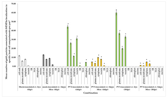 Statistical significance assessment of StEXP immunogold localization in host cell compartments of mock-inoculated and PVYNTN-inoculated potato plants (susceptible and resistant). The figure presents the mean numbers of gold particles located in specific compartments per µm2. The white charts present the StEXPAs in cell compartments of mock-inoculated cv. Irys at 0 dpi. The grey charts present the StEXPAs in cell compartments of mock-inoculated cv. Sárpo Mira at 0 dpi. The light green charts present StEXPA3 in PVY-inoculated cv. Irys at 14 dpi and 30 dpi. The orange charts present StEXPAs in PVY-inoculated cv. Sárpo Mira at 14 dpi and 30 dpi. Quantification immunogold localization was performed using ANOVA. Mean values of gold particle localization were evaluated at the p < 0.05 level of significance using post-hoc Tukey HSD test. Statistically significant values after mock or viral inoculation for both cultivars are marked by asterisks (*) above the bars.