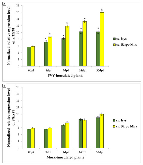 The normalized relative expression level of StEXT4 in PVY-inoculated plants calculated based on the reference gene, StEf1α (A) and in mock-inoculated (B) Irys and Sárpo Mira leaves at 1, 7, 14, and 30 dpi, in combination with ANOVA. Mean values of normalized expression levels were evaluated at the p < 0.05 level of significance using a post-hoc Tukey HSD test. Statistically significant values on different days after mock or virus inoculation for the cultivars are marked by asterisks (*) above the mean value of the normalized expression on each bar.