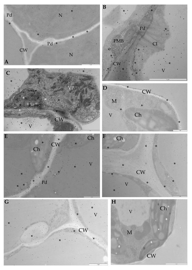 Immunogold localization of HGRP extensins in compatible (B–C) and incompatible (E–G) PVYNTN–potato interactions. (A) HRGPs (*) in mock-inoculated phloem cells in the cell wall, cytoplasm, and nucleus; bar 1 µm (B) HRGPs (*) in the cell wall, plasmolemma, cytoplasm, and vacuoles in mesophyll cells at 14 days post-virus inoculation. Virus cytoplasmic inclusion next to plasmodesmata; bar 1 µm. (C) HRGPs (*) in the changed cell wall, plasmolemma, vacuoles, and cytoplasm mesophyll cells at 30 days post-virus inoculation. Virus particles in cytoplasm; bar 1 µm. (D) HRGPs (*) in the cell wall and cytoplasm of mesophyll cells of mock-inoculated Sárpo Mira plants; bar 1 µm. (E) HRGPs (*) in the cell wall and around the plasmodesmata. Gold deposition in chloroplasts and vacuoles, along the plasmolemma, and in the membranous vesicular structure in mesophyll cells at 14 days post-virus inoculation; bar 1 µm. (F) HRGPs (*) in the cell wall and plasmolemma in phloem parenchyma cells. Gold deposition in cytoplasm, vacuoles, and chloroplasts at 30 days post-virus inoculation; bar 1 µm. (G) HRGPs (*) in the cell wall and plasmolemma in xylem parenchyma cells and xylem tracheary elements at 30 days post-virus inoculation. Gold deposition in cytoplasm and vacuoles; bar 1 µm. (H) Lack of deposition in Sárpo Mira mesophyll cells at 14 days post-inoculation. Section incubated with pre-immune serum; bar 2 µm. Ch—chloroplast; CI—virus cytoplasmic inclusions; CW—cell wall; M—mitochondria; N— nucleus; Pd—plasmodesmata; PMB—paramular bodies; V—vacuole; VP—virus particles; X—xylem tracheary elements; XP—xylem parenchyma.