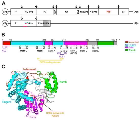 Potyviruses have a positive-sense, single-stranded RNA genome of approximately 10,000 nucleotides that encodes a long open reading frame (ORF) [1,2,3]. During virus replication, RNA polymerase slippage at the 5′ coding region leads to the generation of small sub-populations of viruses with shorter ORFs [1,2,3,6,7,8,9,10,11]. The large polyprotein is proteolytically processed by three viral proteases, i.e., P1 and helper component proteinase (HC-Pro) (each of which acts in cis on its own C-terminal end), and nuclear inclusion a protease (NIa-Pro), responsible for the remaining cleavage sites, to produce 10 functional proteins: P1, HC-Pro, P3, 6K1, cylindrical inclusion (CI) protein, 6K2, viral genome-linked protein (VPg), NIa-Pro, nuclear inclusion b (NIb), and capsid protein (CP) [1,2,3,6]. The small polyproteins consist of P3N-PIPO for most potyviruses, such as TuMV (Figure 1A), or other small transframe products such as P3N-ALT and P1N-PISPO for a few other potyviruses [7,8,9,10,11]. Potyviral NIb is the RNA-dependent RNA polymerase (RdRp) that is absolutely required for potyviral genome replication [12]. All RNA viruses including potyviruses replicate in the cytoplasm, and the process is catalyzed by the cytoplasmic membrane-bound viral replication complexes (VRCs) [13,14,15]. However, the NIb protein contains nuclear localization signals (NLSs) and has nuclear translocation activity. Consistently, it accumulates predominantly in the nucleus and together with NIa forms amorphous or crystalline nuclear inclusions (NIs) in infected cells [12,16,17,18]. Clustered point mutations within the NLSs of NIb that disrupt its nuclear translocation activity abolish viral genome replication, and this replication defection can be rescued in transgenic cells expressing a functional NIb [12]. Thus, NIb functions in trans and may need other viral-replication-associated proteins and/or host factors to deliver its RdRp activity in the VRC [19]. Like other potyviral proteins such as HC-Pro, CI, VPg, and CP, NIb is also a multifunctional protein [20,21,22,23,24,25].