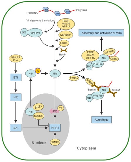 NIb plays contrasting roles in potyvirus infection. After entry into host plant cells, a potyvirus virion undergoes disassembly of viral particles and viral genome translation to produce viral proteins required for replication. The 6K2 or its precursor remodels the ER to form the VRC-containing vesicles at ER exit sites for potyvirus genome replication. The 6K2-induced vesicles may subsequently target chloroplasts for robust viral replication. NIb is recruited to the VRC, likely via its interaction with VPg domain of 6K2-VPg-Pro. NIb recruits many host factors such as poly(A)-binding protein (PABP), eukaryotic elongation factor 1A (eEF1A), heat shock cognate 70-3 (Hsc70-3), A. thaliana RNA helicase AtRH9, and N. benthamiana α-expansin (NbEXPA1). Potyvirus infection activates autophagy in plants and Beclin1 (ATG6) interacts with NIb to directly inhibit NIb activity or mediate autophagic degradation of NIb to restrict virus infection. Beclin1-mediated NIb degradation requires a key autophagic adaptor protein, ATG8a, which targets to Beclin1 to facilitate the docking of the Beclin1–NIb or Beclin1–NIb–VRC complex to autophagosomes. NIb may also act as an avirulence factor to activate ETI by recognition of resistance gene R-encoded proteins such as Pvr4. In addition, the nuclear-localized NIb is sumoylated by SUMO3. The sumoylation of NIb promotes potyvirus infection by relocalization of NIb from the nucleus to the cytoplasm and inhibition of the SUMO3-activated-NPR1-mediated resistance pathway.