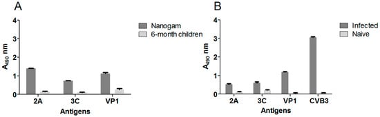 Antibody reactivity towards enterovirus structural and non-structural proteins in serum from 6-month old children, adults and CVB infected mice. (A) 2A, 3C, and CVB3 VP1 antibodies in sera pooled from 6 month-old humans (1:1000 dilution, white) and from Nanogam® serum (1:10,000 dilution, gray bars) and (B) 2A, 3C, VP1, and CVB3 antibodies in pooled naïve (white bars) and CVB3 infected (21 dpi; grey bars) mouse sera (both 1:1000 dilution) as detected by ELISA. Each bar represents a pool of sera (n = 20 for humans, n = 18 for infected mice and n = 4 for naïve mice). Data is presented as means ± S.E.M.