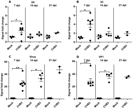 Approximately eight-week-old mice were infected by intraperitoneal 200 µL injection with Coxsackie B 3 viruses (CVB3) or mock-infected with phosphate buffered saline (PBS). Sera from mock (PBS, n = 4), or CVB3 strain Nancy (105 PFU, n = 7) infected mice were collected at different time points before and after infection. Animals were also infected with CVB3 at a dose of 102 PFU for harvesting organs. Animal health was carefully monitored. The mice that were infected for organ harvesting were sacrificed at 3 dpi, whereas the other animals were monitored until 21 dpi, unless euthanized due to reaching humane end-point criteria.