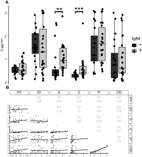 Antibodies against the enteroviral proteases were analyzed in human serum samples which had been tested for IgM antibodies against enterovirus structural proteins. Samples taken from patients with an acute enterovirus-infection (IgM positive, n = 22) were used as well as randomly selected control subjects (IgM negative, n = 20). Sera from IgM positive, acutely infected patients had significantly higher reactivity for the 2A (p = 1.5 × 10−3) and 3C (p = 1.3 × 10−4) proteases when compared to healthy, IgM negative controls, while antibodies against structural proteins (whole virus particle and the VP1 protein) did not differ between the groups (Figure 4A). In addition, the parainfluenza and adenovirus antibody levels showed no difference between the two groups (Figure 4A).