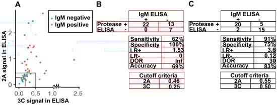 Acute enterovirus infection criteria and test descriptors based on ELISA results. (A) Different cutoff criteria based on 2A and 3C signals (based on 6-month children average + 3 × SD (n = 20) or the adjusted thresholds) and IgM positivity. In the plot (A), IgM positive data points are colored red and control data points are cyan. (B) Confusion matrix and test descriptors calculated from the traditional cutoff values based on results from 6-month children comparing the new protease-ELISA test to the IgM ELISA by analysis in R. Sensitivity is the proportion of true positives and specificity is the proportion of true negatives correctly categorized with respect to IgM ELISA by the protease ELISA. LR+ and LR– stand for positive and negative likelihood ratios respectively and DOR the overall diagnostic odds ratio. (C) Confusion matrix and test descriptors based on the adjusted diagnosis criteria.
