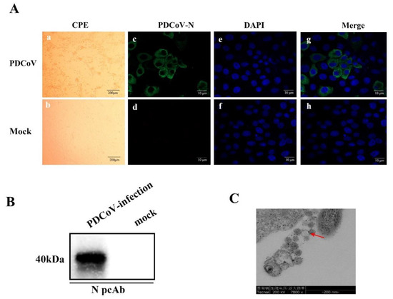 Cells were obtained from the China Center for Type Culture Collection (Wuhan, China). LLC-PK cells were cultured in DMEM (Hyclone, USA) containing 10% fetal bovine serum (FBS) (Gibco) and the maintenance medium for PDCoV propagation was DMEM supplemented with 6 μg/mL trypsin (Gibco, USA) in a 5% CO2 incubator. LLC-PK cells were cultured in six-well plates to 90% of the cell monolayer, washed three times, and maintained with 0.5 mL filtered inoculum in 1.5 mL of maintenance medium for 2 h. After virus adsorption, the cells were then washed three times with PBS and cultured continuously in 2 mL maintenance medium at 37 °C in 5% CO2. At 24 hpi, an obvious cytopathic effect (CPE) was observed in the treated cells; the infected cells were lysed using a freeze-thaw method, and centrifuged (4000 g at 4 °C for 10 min). The supernatants were stored at −80 °C. The virus was serially propagated for three passages and titrated in LLC-PK cells. The isolate (designated as CHN-JS-2017) was purified by plaque purification and tested with the median tissue culture infectious dose (TCID50) assay protocol, as described previously [7].