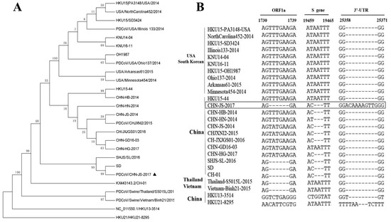 To characterize viral isolates, genome-wide sequencing and multi-sequence alignment and phylogenetic analysis are needed. All known PDCoV strains have high levels of nucleotide sequence identity. It is worth noting that the PDCoV CHN-JS-2017 strain can be clustered into a clade with other strains from mainland China, indicating that the current PDCoV strains are prevalent in many provinces in China. The PDCoV strain CHN-JS-2017 genome is more like the strains from China, the United States, and South Korea than the Thailand strain, while the PDCoV strains from Thailand and Vietnam are clustered in another clade. However, whether these unique variants contribute to the efficiency and virulence of viral replication requires further investigation. Pending further validation, mutations in the nsp2 and S gene imply that these unique variations contribute to the enhanced virulence of this strain. Additionally, a 10-nt insertion in this strain was found in the 3′UTR, which is different to the other PDCoV strain; the PDCoV strain HKU21-8295 from the common-moorhen also contained this 7-nt insertion, and HKU13-3514 from munia also contained this 1-nt insertion, indicating that these insertions in the 3′UTR may be related to cross-species transmissibility.