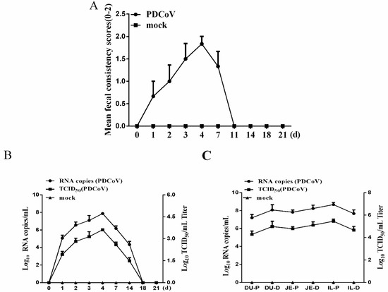 PDCoV RNA was detected by RT-qPCR in feces collected from piglets in the oral challenge group, and all piglets were found to exhibit peak virus shedding of 105–108 copies/mL or 104–106 TCID50/mL in feces at 2–6 dpi and high levels in the feces. Virus shedding occurred for about a week; after that, the virus shedding was gradually reduced, reaching a level which was undetectable by RT-PCR at 18 dpi (Figure 3B). The distribution of CHN-JS-2017 in various tissues was also examined by quantitative real-time RT-qPCR in three pigs from each group sacrificed at 4 dpi. Viral RNA was detected in duodenums (average 107.64 copies/mL or 105.79 TCID50/mL), jejunum (average 108.03 copies/mL or 106.18 TCID50/mL), ileum (average 108.16 copies/mL or 106.32 TCID50/mL) (Figure 3C). No PDCoV RNA was detected in the negative control piglets.