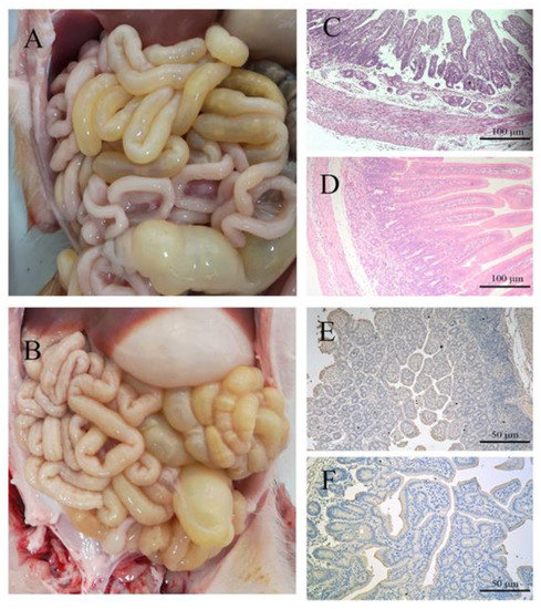 Intestinal changes of infected and uninfected piglets challenged with PDCoV CHN-JS-2017. (A) Macroscopic damage of piglets challenged with PDCoV at 4 dpi. (B) Macroscopic view of 4 dpi negative control piglets. (C,D) Hematoxylin and eosin (H&E)-stained jejunal tissue sections of piglets challenged with PDCoV (C) or negative control piglets (D). (E,F) Immunohistochemically stained jejunal tissue sections of challenged piglets (E) or negative control piglets (F).
