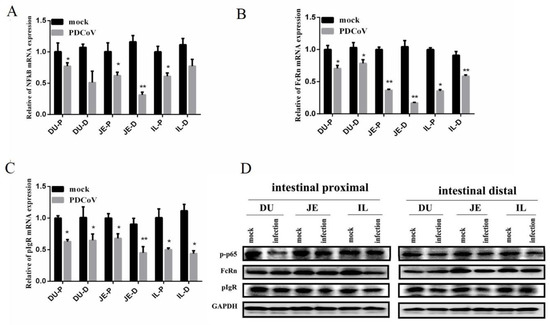 To characterize the effects of PDCoV infection, the levels of NF-κB FcRn, and pIgR in the intestinal mucosa of infected or non-infected control piglets were examined. The mRNA levels of NF-κB, FcRn, and pIgR mRNA in the intestinal mucosa of piglets were statistically significantly reduced (p < 0.01) compared to the control group, especially in the jejunum (Figure 5A–C). Moreover, the levels of NF-κB, FcRn, and pIgR in the jejunum proximal (JE-P) levels of mRNA were significantly lower than in the jejunum distal (JE-D). Similar, the protein expression of NF-κB, FcRn, and pIgR were found to be consistent with the results of RT-PCR (Figure 5D).