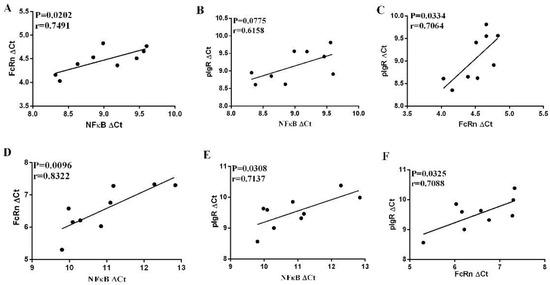 As shown above, the mRNA levels of FcRn, pIgR, and NF-κB genes tend to be lower after PDCoV infection. It has been reported that NF-κB is involved in the regulation of FcRn and pIgR expression in mice. Therefore, the correlation between the mRNA levels of these genes was examined.