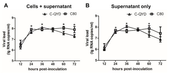 Growth kinetics of DHAV-1 in DEF cells. The fifth cell passage viruses of C-QYD and C80 were used to inoculate DEF cells at a MOI corresponding to one copy/cell. Viral yields in DEF cells were reflected by RNA copies detected with RT-qPCR. At each time point, cells + supernatant (A) and supernatant only (B) were respectively collected from three wells of 24-well plates. Error bars represent the SD (n = 3); * p < 0.05.
