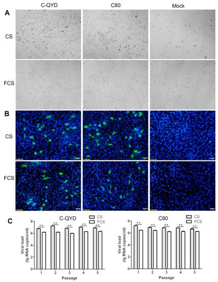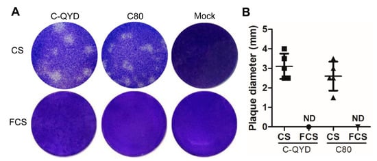 Confluent monolayers of DEF cells grown on 24-well plates were infected with virus, as described in Section 2.4. Next, the cultures were divided into four groups: the first and second groups received 2% FCS DMEM and 2% CS DMEM, respectively, and the third and fourth groups received 0.5 mL of DMEM. Following incubation at 37 °C for 1 h, the third and fourth groups received FCS and CS (final concentration of 2%), respectively. Incubation at 37 °C in a CO2 incubator was continued. The supernatant was sampled at 24 hpi for C80 and at 36 hpi for C-QYD and tested for viral loads.