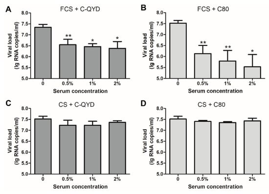 Quantitation of DHAV-1 genome replication in DEF cells inoculated with serum–virus mixture. The DHAV-1 C-QYD and C80 strains were individually preincubated with three concentrations (0.5%, 1%, and 2%) of FCS (A,B) and CS (C,D) at 37 °C for 1 h. DMEM–virus mixture was included as control. For each serum concentration, samples (cells + supernatant) were collected from three wells of 24-well plates. Viral load in each sample was quantified by RT-qPCR. Error bars represent the SD (n = 3); * p < 0.05; ** p < 0.01.