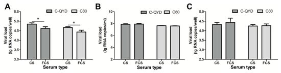 To test whether FCS has an effect on extracellular virus yields, we detected viral loads in supernatants of infected DEF cells maintained in maintenance medium at 1 and 2 hpi, respectively. In this analysis, viral loads were detected at 24 hpi for C80 and 36 hpi for C-QYD, which were determined on the basis of replication kinetics (Figure 1B). Compared with CS, addition of FCS in maintenance medium at both one and two hours after inoculation resulted in significant decreases in viral loads in supernatants (Figure 7A,B) (p < 0.05). These data indicate that FCS has significant inhibitory effect on extracellular virus yields.