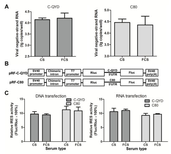 To test whether FCS inhibits viral RNA replication, the negative strand replicative–intermediate of DHAV-1 was quantified at 6 hpi. Incorporation of FCS and CS in maintenance medium produced comparable amounts of negative strand RNA in DEF cells infected by C-QYD and C80 (p > 0.05; Figure 6A), indicating that FCS may have no or little effect on intracellular RNA replication.
