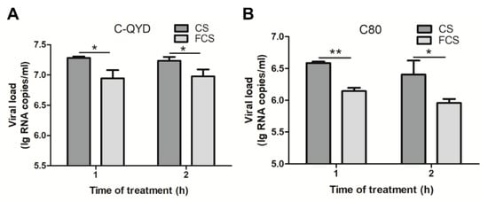 Analysis of effect of FCS on extracellular viral loads. DEF cells inoculated with C-QYD (A) or C80 (B) were maintained with DMEM and treated with FCS at 37 °C by addition of FCS into the wells at 1 and 2 hpi respectively, and CS was included as a control. The supernatants were collected from three well of 24-well plates, and the viral loads were quantified by RT-qPCR assay. Error bars represent the SD (n = 3); * p < 0.05; ** p < 0.01.