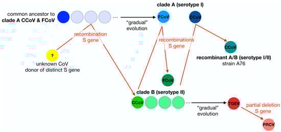 Diagram of the S gene flow within the Alphacoronavirus 1 species. In this schematic diagram the evolution of members of the Alphacoronavirus 1 species is summarized using a S gene-centric view. It is thought that clade A (serotype I) CCoV and FCoV share a common ancestor. A recombination event with an unknown coronavirus allowed the emergence of a clade B (serotype II) CCoV with a S protein distinct from clade A CCoV. Multiple independent recombination events led to the emergence of clade B (serotype II) FCoV and recombinant A/B (serotype I/II) CCoV. TGEV is believed to have emerged from clade B CCoV. Partial deletion of the N-terminal domain of the S protein of TGEV gave rise to PRCV.