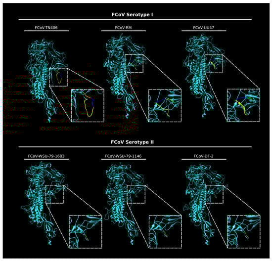 In silico modeling of the S protein from FCoV I and FCoV II strains. In silico FCoV S models of three FCoV type I strains (FCoV-RM, FCoV-UU47 and FCoV-TN406) and three FCoV type II strains (FCoV-DF-2, FCoV-WSU-79-1683 and FCoV-WSU-79-1146) were built using Chimera (UCSF Chimera v. 1.13.1, University of California). The S1/S2 region (dashed squares) was magnified to better visualize the differences between the two serotypes. The 16 amino acid insertion corresponding to the S1/S2 site (bright blue) and the 10 amino acid flanking region (yellow) were predicted as a flexible loop only in the FCoV type I S models.