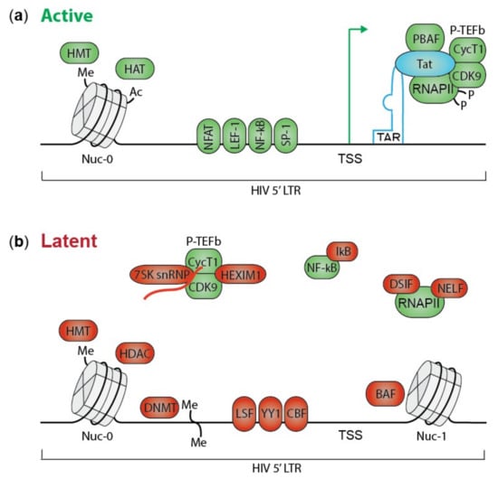 HIV transcription is a complex machinery involving many viral and cellular factors. During productive infection, HIV initially produces short completely spliced transcripts encoding transactivator of transcription (Tat) and regulator of virion expression (Rev). When the amount of Tat protein reaches a certain threshold, it binds to the TAR RNA stem loop in the HIV LTR promoter stimulating transcription elongation (Figure 1a) []. Tat recruits the positive transcription elongation factor complex (P-TEFb), consisting of cyclin-dependent kinase 9 (CDK9) and Cyclin T1, to the transcription start site (TSS) in the LTR promoter []. Next, CDK9 releases and activates RNA polymerase II (RNAPII) that is sequestered by negative elongation factor (NELF) and DRB sensitivity inducing factors (DSIF) []. Furthermore, Tat recruits the active chromatin remodeling PBAF (polybromo-associated BRG-associated factor) complex promoting open chromatin []. Changes in these factors can silence HIV transcription resulting in latent infections.