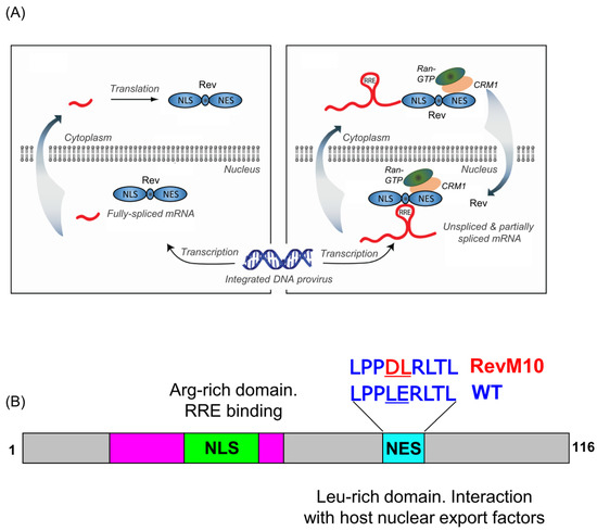 (A) Functional requirement of the HIV RRE: Early in the viral lifecycle, fully spliced viral RNAs are exported from the nucleus in a Rev/RRE-independent manner. Among these, Rev mRNA are translated and Rev is imported into the nucleus. In the late phase of the lifecycle, nuclear RRE-containing RNAs recruit Rev and cellular nuclear-export machinery, allowing them to circumvent splicing and transit to the cytoplasm, where they are either translated or packaged into assembling virions (B) Organization of the 116 aa HIV-1 Rev and amino acid changes in the trans-dominant M10 variant. NLS; nuclear localization signal, NES, nuclear export signal. Pink areas flanking the NLS represent Rev oligomerization domains.