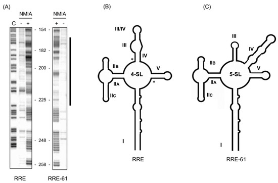 Mutations conferring resistance to trans-dominant RevM10 therapy induce a conformational change in the HIV-1 RRE. (A) Structural probing of the wild-type RRE (left) and RevM10-resistant RRE-61 (right). (C) Control DNA sequencing lane from which nucleotide numbering was derived. Designations − and + refer to untreated and NMIA-treated RNA, respectively. Major alterations in chemical reactivity are indicated by the bar. (B,C) Cartoons depicting SHAPE-derived conformations of wild-type RRE and RRE-61. SL, stem-loop. Positions of RRE point mutations, inducing RevM10 resistance, are indicated by asterisks in (B). Modified from Reference [47].