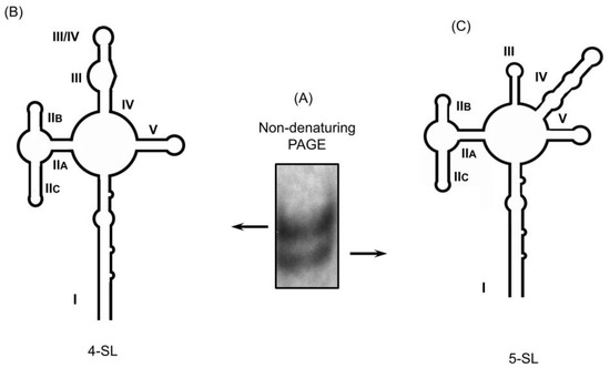 Since chemical probing techniques used in these studies provide ensemble-average structural information, it could not be excluded that RRE structural heterogeneity might give rise to such discrepancies. In-gel probing, in contrast, offers an alternative strategy to examine conformationally heterogeneous RNAs, providing that they can be separated by non-denaturing strategies. As an example, Kenyon et al. [51] applied in-gel SHAPE to define the structure of monomeric and dimeric species of the HIV-1 packaging signal RNA, supporting a structural switch model of RNA genomic dimerization and packaging [51]. In light of (i), HIV-2 RRE conformational heterogeneity (see later) and (ii), the observation that a single nucleotide alteration sufficed to stabilize the 5 SL HIV-1 RRE conformer [47], we showed that by extended non-denaturing polyacrylamide gel electrophoresis that the HIV-1 RRE could be resolved into two closely migrating species (Figure 3A) [52]. Subsequent in-gel SHAPE verified the slower migrating RNA as the 4 SL conformer and the faster migrating RNA as the 5 SL conformer (Figure 3B,C, respectively), suggesting that in vivo, the wild-type HIV-1 RRE could exist in a conformational equilibrium.