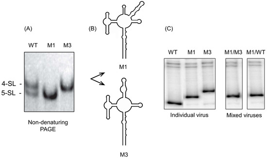 Alternative HIV-1 RRE conformers promote different rates of virus replication. (A) Conformer construction (see text). (B) Chemical acylation (SHAPE) confirms a 5 SL conformation of mutant M1 and a 4 SL conformation of mutant M3. (C) Heteroduplex tracking analysis. In both M1/wt and M1/M3 mutant co-infections, the stabilized 5 SL M1 conformer displays a replicative growth advantage. The full experimental background is provided in Reference [52].