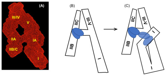 Time-dependent conformational rearrangement of the HIV-2 RRE. Analyses were performed on a 216 nt RRE derived from HIV-2ROD by in vitro transcription. (A) Native gel electrophoresis as a function of incubation time indicates the HIV-2 RRE comprises a mixture of “open”, “intermediate”, and “closed” conformers (A–C, respectively) at short incubation times and whose ratio varies with time, with the closed conformer ultimately predominating. (B) SHAPE-derived conformations of the open, intermediate, and closed HIV-2 RRE forms, respectively. Secondary structural motifs are indicated and color-coded as follows: SL-I, red; S-IIA, dark green, SL-IIB, -IIC and adjacent connecting loops, magenta; SL-III, yellow; SL-IV, blue; SL-V, orange. Modified from Reference [64].