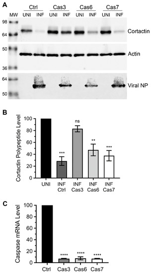 - Chen, D.Y.; Husain, M. Caspase-mediated degradation of host cortactin that promotes influenza A virus infection in epithelial cells. Virology 2016, 497, 146–156. [Google Scholar] [CrossRef] [PubMed]
