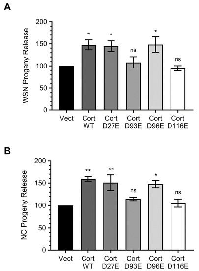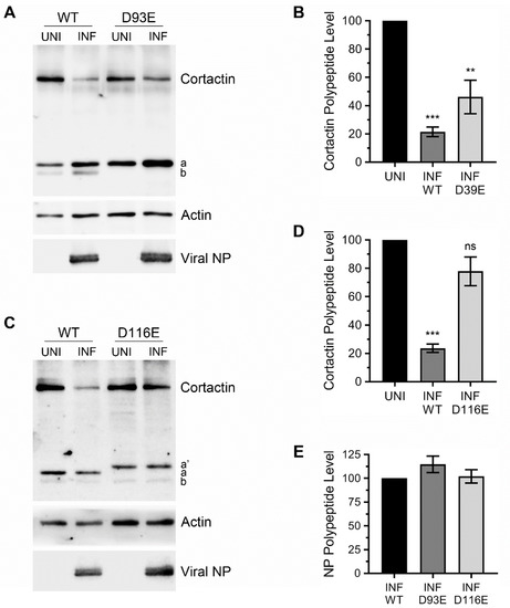3.4. Ectopically Expressed Cortactin D93E and D116E Mutants Decrease the Amount of IAV Progeny Released from Infected Cells that is Enhanced by Cortactin WT