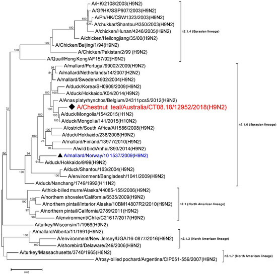Phylogenetic analysis of the N2 gene segment. The nucleotide sequences were aligned and analyzed using the maximum likelihood method in MEGA 7.0 [40], using the Tamura three-parameter (T92+G) [46] model with a bootstrapping of 1000 replicates. The analysis involved 38 sequences of the N2 gene segment of influenza virus, including A/Chestnut teal/Australia/CT08.18/12952/2018 (H9N2), from a resident Chestnut teal. The numbers at the nodes represent bootstrap values, and only bootstrap values at or above 60% are shown. Branch lengths are scaled according to the number of nucleotide substitutions per site. The sequence from the current study has been labelled with a black rhombus (♦), while a representative reference sequence from Eurasian lineage has been labelled with a black triangle (▲), with text in blue color, and is shown on all figures for easy reference. Red colored sequences are from AIVs detected in Australia.