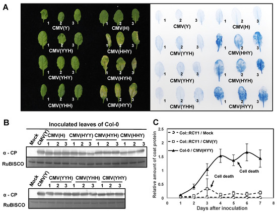 Schematic structures of the reassortant CMV RNA genomes of the two parent CMV strains, CMV(Y) and CMV(H), are shown in Figure S1. When fully-expanded leaves of three independent A. thaliana ecotype Col-0 plant were inoculated with one of the reassortant CMVs [CMV(HHY), CMV(HYY), CMV(YHH), CMV(YYH), CMV(YHY) or CMV(HYH); and CMV(Y) or CMV(H) strain as a control], a cell death developed at 5 dpi in those inoculated with three of the reassortant CMVs containing CMV(H) RNA1: CMV(HHY), CMV(HYY), or CMV(HYH). However, cell death did not occur in Col-0 leaves inoculated with other reassortant CMV, CMV(Y), or CMV(H) (Figure 1A and Figure S2). At 5 dpi, cell death (which affected a much larger area in comparison with HR cell death) developed in Col-0 leaves inoculated with CMV(HHY), CMV(HYY), or CMV(HYH); whereas HR cell death developed in CMV(Y)-inoculated leaves of RCY1-transformed Col-0 (Col::RCY1) at 3 dpi (Figure 1A and Figure S2A,B). These results suggest that CMV(H) RNA1 might be associated with cell death development in reassortant CMV-inoculated leaves through its interaction with CMV(Y) RNA2 or CMV(Y) RNA3 and a characteristic of this cell death is to spread to a broader area around the virus primary infection site than occurs with HR cell death.