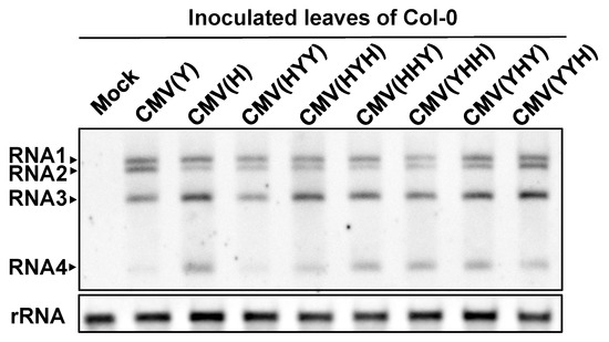 To generate the reassortant CMVs including CMV(HYY), CMV(YHY), CMV(YHH), CMV(YYH), CMV(HYH), and CMV(HHY) (Figure S1), each infectious CMV RNA1, RNA2, and RNA3 was reciprocally exchanged between CMV(Y) and CMV(H). Four-week-old N. benthamiana was rub-inoculated with a combination of infectious CMV(Y) and CMV(H) RNA1, RNA2, and RNA3 to propagate a series of reassortant CMVs. At 7 days post-inoculation (dpi), the inoculated leaves were collected and weighed, and then ground in 10× volume of 0.1 M phosphate-buffered saline (pH 8.0) on ice. These homogenates were used to inoculate new fully expanded leaves of 6-week-old N. benthamiana plants. At 4 dpi, the inoculated leaves were harvested and used for virus purification. Virus purification was performed according to a previously described procedure [38].