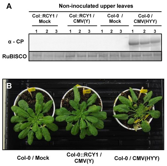 Detection of CMV CP in noninoculated upper Arabidopsis thaliana ecotype Col-0 leaves and systemic symptom development. (A) CMV CP detected at 7 dpi, by western blot analysis, in noninoculated upper leaves of CMV(HYY)-infected or mock-inoculated Col-0 [Col-0/CMV(HYY) and Col-0/Mock] and CMV(Y)-inoculated or mock-inoculated Col::RCY1 [Col::RCY1/CMV(Y) and Col::RCY1/Mock]. RuBISCO protein is an internal reference for protein quantity. Each experiment was conducted using three independent biological replicates (plant numbers 1, 2, and 3). (B) Symptom appearance observed at 14 dpi on CMV(HYY)-inoculated Col-0 [Col-0/CMV(HYY)], CMV(Y)-inoculated Col::RCY1 [Col::RCY1/CMV(Y)], or mock-inoculated Col-0 [Col-0/Mock] (control). Virus-inoculated leaves have been removed because they were already dead at this stage. Representative plants were photographed.