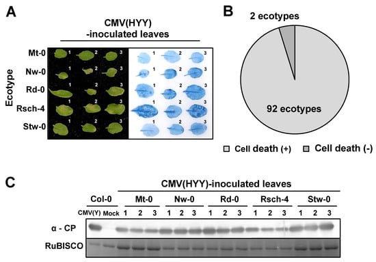 Survey of the response to CMV(HYY)-inoculation on the leaves of 94 ecotypes of Arabidopsis thaliana. (A) Representative photograph of the responses: CMV(HYY)-inoculated leaves of five ecotypes randomly selected at 14 dpi. Virus-inoculated leaves under bright field (left panel) and stained with trypan blue (right panel). (B) Pie chart summary of CMV(HYY)-inoculated leaves of the 94 ecotypes. (C) CMV CP detected immunologically by western blot analysis in virus-inoculated leaves of three independent biological replicates (numbers 1, 2, and 3) of five selected ecotypes at 7 dpi. RuBISCO protein is an internal reference for protein quantity.