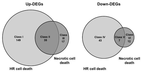 Venn diagram of the number of genes with increased or decreased transcript abundance in CMV(HYY)-inoculated Arabidopsis thaliana Col-0 leaves showing necrotic cell death and CMV(Y)-inoculated Col::RCY1 leaves showing HR cell death. The number of genes detected by RNA-Seq analysis with more than 4-fold increased expression and adjusted p < 0.05 in CMV(HYY)-inoculated Col-0 leaves and CMV(Y)-inoculated Col::RCY1 leaves are shown at left (Up-DEGs). Those with less than 0.25-fold decreased expression (p < 0.05) are shown at right (Down-DEGs). The number of genes with increased and decreased expression in leaves showing HR cell death are shown in the light gray circles; and those showing necrotic cell death in the dark gray circles.
