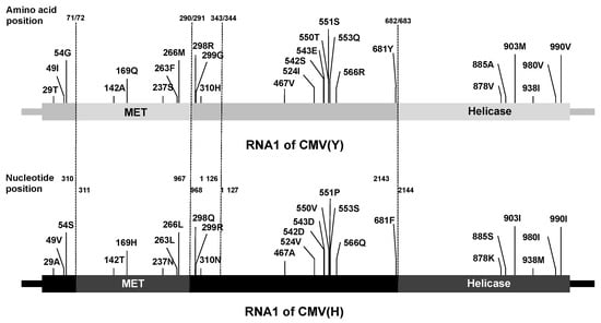 Schematic diagram of the CMV RNA1 encoding the 1a protein, which contains a methyltransferase (MET) and a helicase (HEL) domain. The 1a protein-coding region and corresponding 1a protein are shown as rectangles. Amino acids that differ between the 1a proteins encoded by the CMV(H) RNA1 (lower panel) and the CMV(Y) RNA1 (upper panel) and the positions of these amino acids in the 1a protein are described above each rectangle. The dotted lines connecting the two chimeric constructs indicate the amino acid and nucleotide positions of junction sites. The adjacent sequence numbers of each of these junctions are indicated above the CMV(Y) RNA1 (upper) schematic for amino acids; and above the CMV(H) RNA1 (lower) schematic for the corresponding nucleotides.