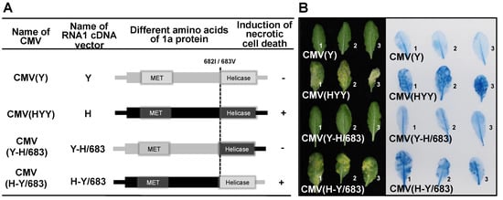 Induction of necrotic cell death in Arabidopsis thaliana ecotype Col-0 leaves inoculated with reassortant CMVs, CMV(H-Y/683) and CMV(Y-H/683), which carry chimeric 1a protein of CMV(Y) and CMV(H), CMV(Y), and CMV(HYY). (A) Schematic diagram of the CMV RNA1 encoding the 1a protein. The 1a protein-coding region (and its corresponding 1a protein) is presented as rectangles in black for CMV(H) and in gray for CMV(Y). The dotted line indicates the junction site at amino acid position 682/683. MET, 1a protein methyltransferase domain; HEL, helicase domain. The presence (+) or absence (−) of necrotic cell death induction in virus-inoculated leaves is shown in the column on the right. (B) Responses of CMV-inoculated leaves for three independent biological replicates (plants number 1, 2, and 3). Virus-inoculated leaves to the left are under bright field and those to the right are stained with trypan blue.
