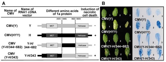 Cell death in CMV-inoculated leaves was visualized by staining with trypan blue according to a standard protocol [41]. Virus-inoculated leaves were stained by boiling for 8 min in alcoholic lactophenol [99.5% ethanol:phenol:glycerol:lactic acid 4:1:1:1 (v:v:v:v)] containing 0.1 mg/mL trypan blue. The stained leaves were decolorized in a 2.5 g/mL chloral hydrate solution overnight, and then held and pictured in 70% ethanol. Trypan blue staining is available to detect cell death qualitatively, but it has limitations in attempting to show a quantitative measure of cell death.