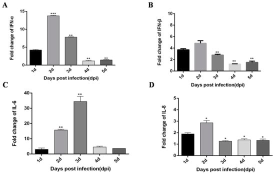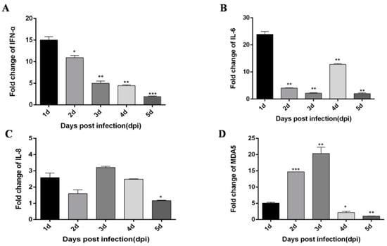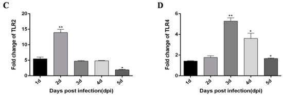 In liver tissues, IFN-α and IFN-β expression trends were different from those in the thymus. Although the expression levels were also significantly increased, in liver tissues, IFN-α expression levels were significantly increased in the first two days, then the expression trend was stable (Figure 3A). IFN-β peaked 4 dpi (Figure 3B). The expression of pro-inflammatory factor IL-6 peaked on the 4 dpi (Figure 3C). However, the expression trend of IL-8 was somewhat complicated, reaching a peak on the first day, then decreased compared with the first day, and increased again on the 4 dpi (Figure 3D). The expression level of the major immune factor MDA5 in the RIG-I pathway peaked on 2 dpi (Figure 4A), and the major immune factors in the TLRs pathway MyD88, TLR2 and TLR4 peaked on 3 dpi, 2 dpi, and 3 dpi respectively (Figure 4B–D).