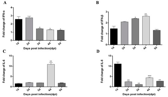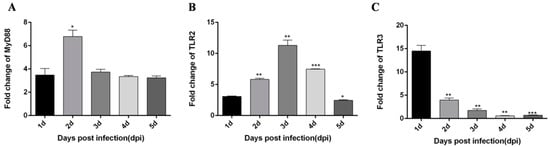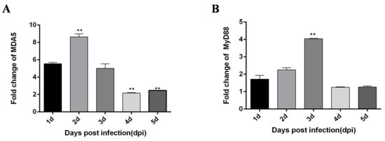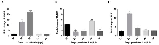 Based on a previous study [21], DTMUV infection of CEF cells and HEK293 cells can trigger a robust innate immune response, in which TLR3 and MDA5 play an important role. Moreover, Yu et al. [22] performed high-throughput sequencing and found that DTMUV-infected DEF cells exhibit various innate immunity processes, which notably include the TLRs and RLRs signaling pathways. Moreover, we found other flaviviruses, like dengue virus (DENV), Zika virus (ZIKV) and West Nile virus (WNV) can also trigger robust innate immunity processes including TLRs and RLRs signaling pathways. Therefore, we speculate DTMUV infected ducks would also elicit similar innate immunity processes. To determine whether DTMUV infection of ducklings can also elicit robust innate immunity, we examined the expression of TLRs, RLRs, type I IFN, and pro-inflammatory cytokines in thymus, liver, and spleen tissues. First, 5-day-old ducklings were challenged with DTMUV or PBS, after which thymus, liver, and spleen samples were harvested during the early post-infection period. In general, the expression of all cytokines was increased, but the degree of the increase differed depending on tissue type and time. In thymus tissue, IFN-α and IFN-β both peak on day 2 after infection (Figure 1A,B). Pro-inflammatory cytokines IL-6 and IL-8 peak on the 3 dpi and 2 dpi, respectively (Figure 1C,D). In addition, important immune factors in the RIG-I and TLRs pathways are also significantly increased after DTMUV infection. Among them, MDA5 peaked on the 3 dpi (Figure 2A), MyD88 peaked on the 4 dpi (Figure 2B), and TLR2 peaked on the 2 dpi (Figure 2C).