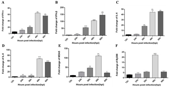 Although Yu et al. [22] reported expression changes for some innate immune cytokines in DTMUV-infected DEF cells, the degrees of change and trends of expression were not described. To address this, we infected DEF cells with DTMUV and assessed the expression of TLRs, RLRs, inflammatory cytokines and type I IFN at different time points. Similar to the results for DTMUV-infected ducklings, MDA5, and TLR3 expression were significantly increased in the early post-infection period compared with other PRRs. Specifically, the expression levels of IFN-α and IFN-β increased with the time of virus infection, in which IFN-α peaked at 48 h, while the expression levels of IFN-β did not decline within 60 h after infection (Figure 7A,B). Pro-inflammatory factor IL-6 did not decline within 60 h after infection, while IL-8 expressions peaked at 48 h (Figure 7C,D). The expression levels of both RIG-I and MDA5, important factors in the RIG-I pathway, were also increased, in which MDA5 peaked at 48 h after infection, while RIG-I peaked at 36 h, then decreased, and increased again at 60 h (Figure 7E and Figure 8D). However, the expression trend of immune factors in the TLRs pathway is relatively simple. MyD88, TLR2, TLR3, and TLR4 peak at 48, 24, 12, and 36 h after infection (Figure 7F and Figure 8A–C). Then we compared the expressions of RLRs and TLRs after infection, and found that the expressions of MDA5 were much higher than RIG-I (Figure 8E), while the expressions of TLR3 was much higher than those of TLR2 and TLR4 (Figure 8F). These results demonstrate that DTMUV can trigger a strong innate immune response in vitro, in which TLR3 and MDA5 appear to have important roles.